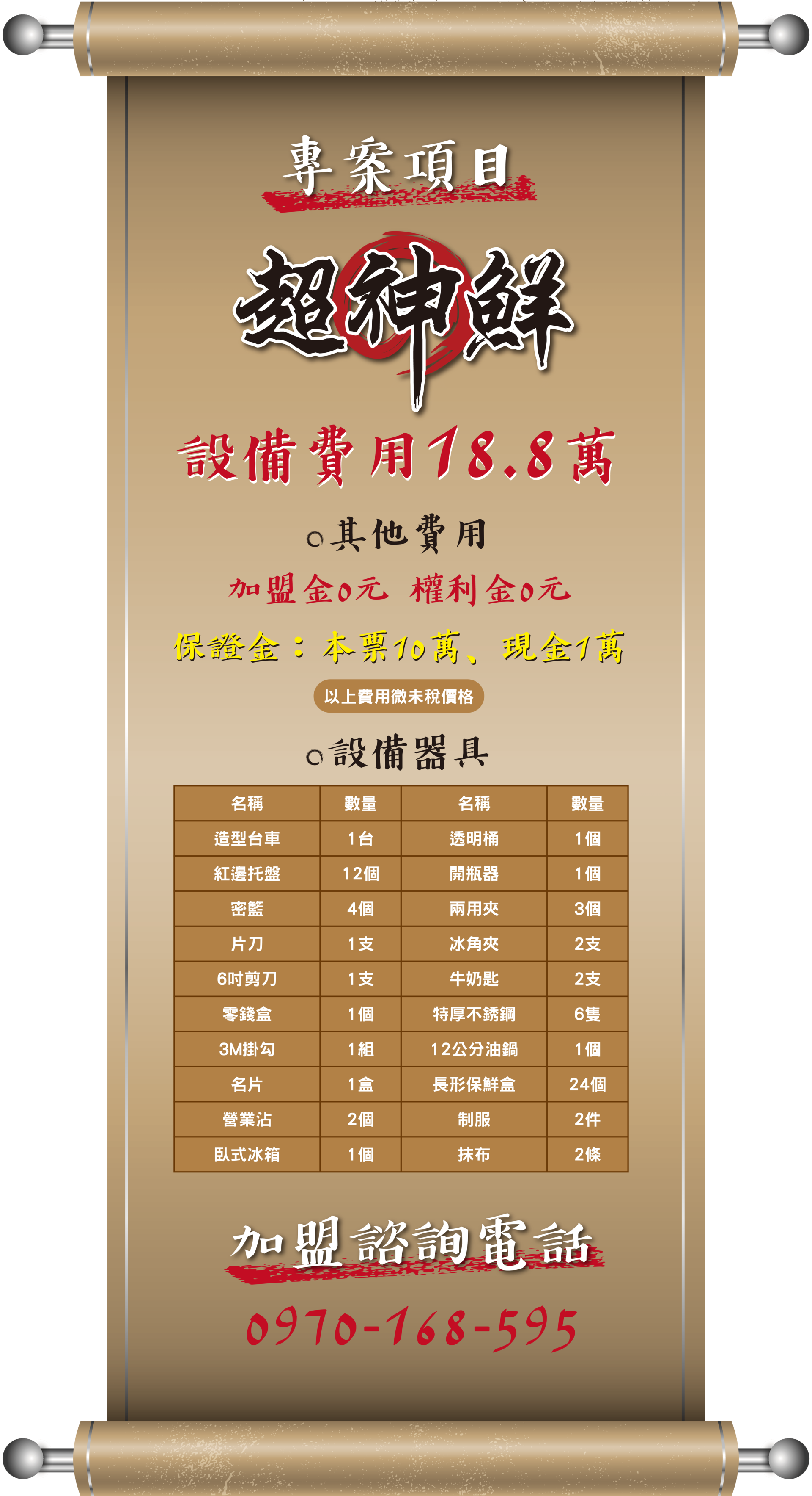 時光流逝,終於獲得當地人對品牌的認可,於是在2015年時成立了『超神鮮10元壽司』品牌。開始打響10元壽司的知名度。讓想創業的人有一個更便捷的管道。